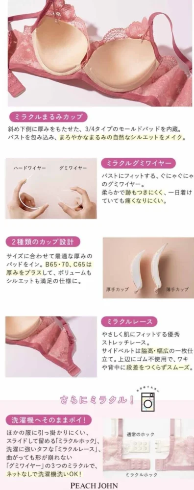 「ミラクルブラ」は繊細な見た目なのにタフなレースで大人気のブラ「ミラクルヌーディ®ブラ」の進化版。新たにふっくらまるみを生むバストメイクの機能を追加。