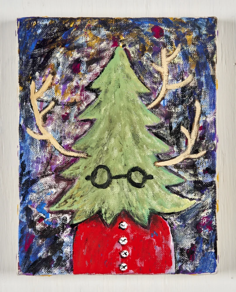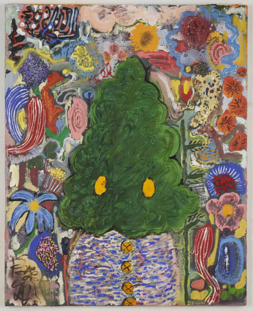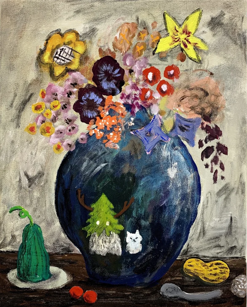 絶え間なく変化を続ける自然環境にともない、人々の自然に対する価値観も変容していくことに着目し、平子は今回の展覧会に「GIFT」と名付けました。例えば、プレゼントとして贈られた花は当初美しく咲き誇り、その美しさを保つために人は毎日水を替えて手入れを施し飾りますが、時間が経ち枯れてしまえば不要なものとみなし廃棄される対象になります。また、果てしない歳月を経た樹木が神格化され御神木として祀られるように、体感的な時間の感覚や利己的な価値観によって自然は選別され、人間に都合よく消費されていくのです。それを象徴するのが、平子の絵画にしばしば描かれる樹木と人間が融合した登場人物。人種や国籍によらず、花は誰しもがもらってうれしい必要なもの、雑草は花の成長を妨げる不要なもの、と成長の過程で無意識のうちに人間が学びとり、判断を下すプロフェッショナルになっていくことを具現化したキャラクターです。一見ユーモラスで可愛らしい姿をしていますが、人間のエゴを体現する存在です。自身の種を絶やさず繁栄するために戦略的に生み出されたフォルムを持つ美しい花も、その価値を見出した人間により咲き誇った最高潮の時点で無残にも刈り取られ切り花となり、時が経てば捨て去られる運命にあることを暗に示唆しています。