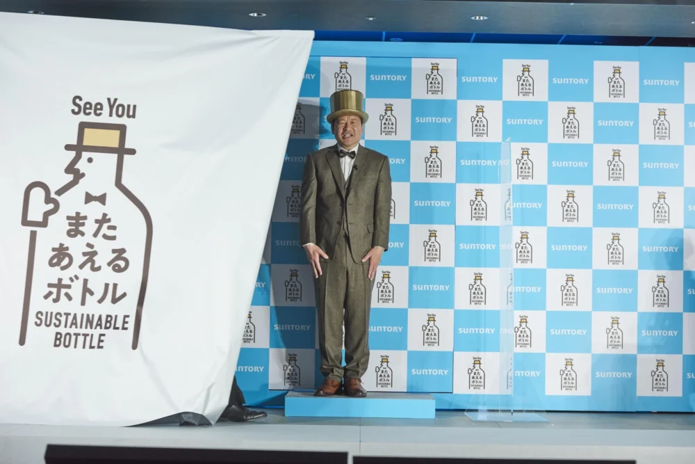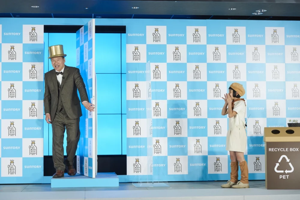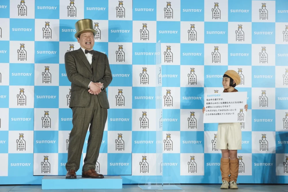 コンセプトムービー同様、ムギちゃんは茶色のベレー帽を被り、佐藤さんは金色の帽子を被った姿で登場。ペットボトルは何度も循環する資源であることを分かりやすく伝えるコンセプトムービー「ムギちゃんとふしぎなおじさん」で、人生初めてというペットボトル役に扮した佐藤さんは、「51歳で滑り台に逆さで挟まるとは。公園の滑り台が、僕がぴったり挟まるサイズで。とても大変でしたが、なかなか経験できないことで楽しかったです、あははは」と笑いながらコメント。また、ムギちゃんとの共演に「いい意味で子役っぽくない自然体で、とっても可愛らしい子でしたね。特にコンセプトムービー最後のリサイクルボックスに『またね』と話すシーンが、まぁ~可愛い」と印象を教えてくれました。
