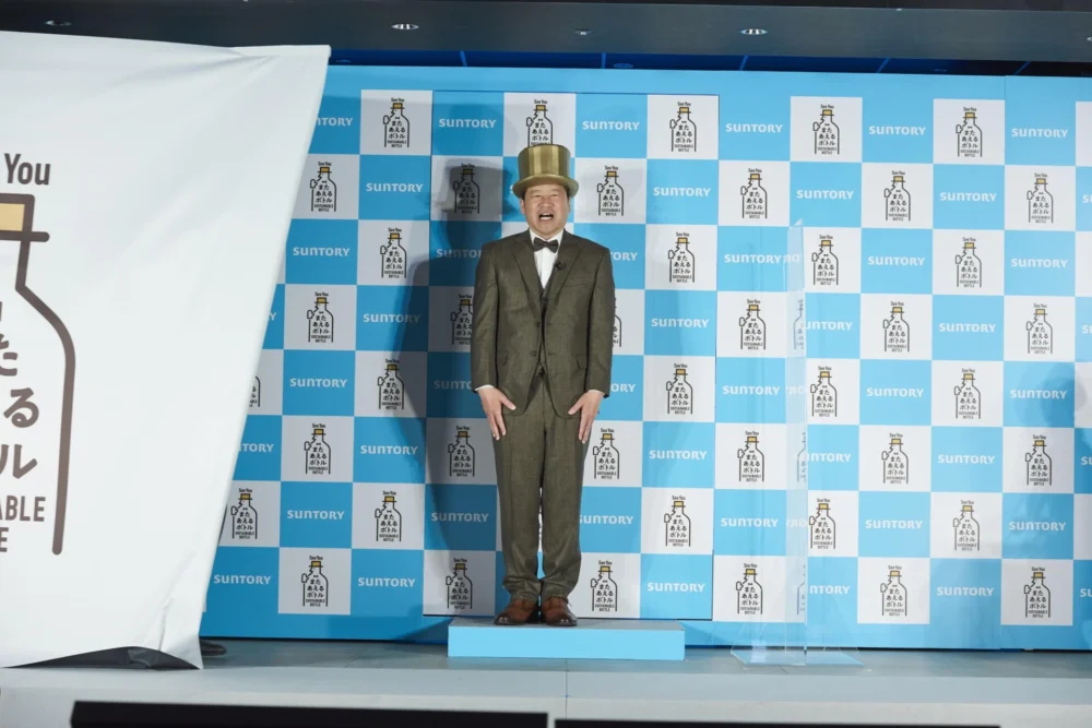 イベント中盤では、2人が出演するコンセプトムービーの内容を実際に再現することに。佐藤さんが「うまく生まれ変われるか心配ですが、ムギちゃんを信じて身をゆだねたいと思います」と意気込むと、ムギちゃんはペットボトルを「またね!」とリサイクルボックスに投入。佐藤さんがベールに包まれると、その間にペットボトルがリサイクルされ生まれ変わっていく様子をムギちゃんが説明してくれました。そして説明が終わりいざベールをはがすと、そこには佐藤さんの姿が見当たらず、なんと巨大なやさしい麦茶のペットボトルの姿が!ムギちゃんが「おじさーん?」と声を掛けると、「どうも、こんにちは、やさしい麦茶です。フォルムはあんまり変わらないですが、佐藤二朗と見分けられますか?あはははは」と、生まれ変わったペットボトルの姿のまま、ステージ裏に隠れた佐藤さんがコメント。「こうやって何度も生まれ変わるっていうのは気持ちがいいね!」と、リサイクルされた感想も教えてくれました。