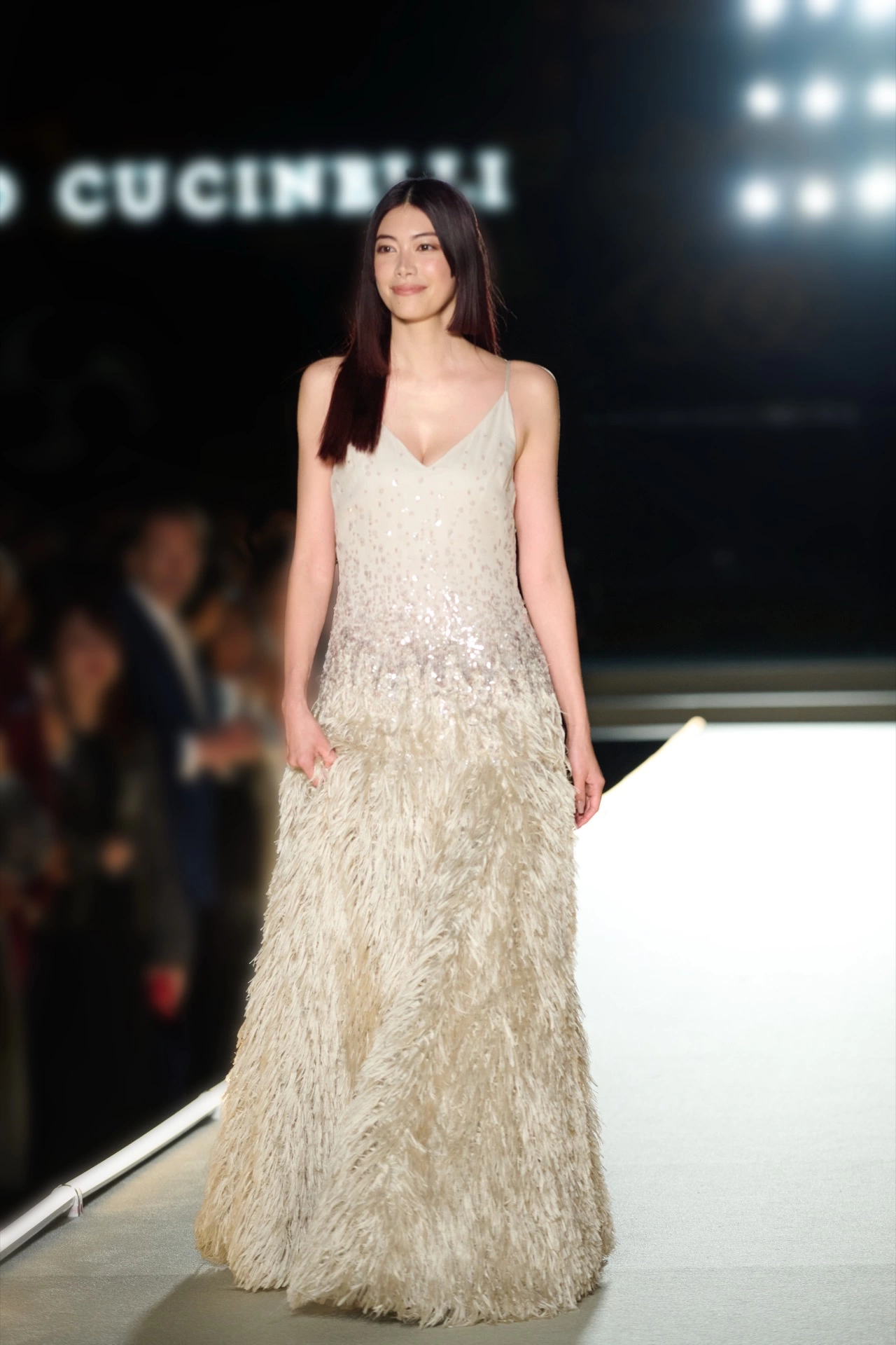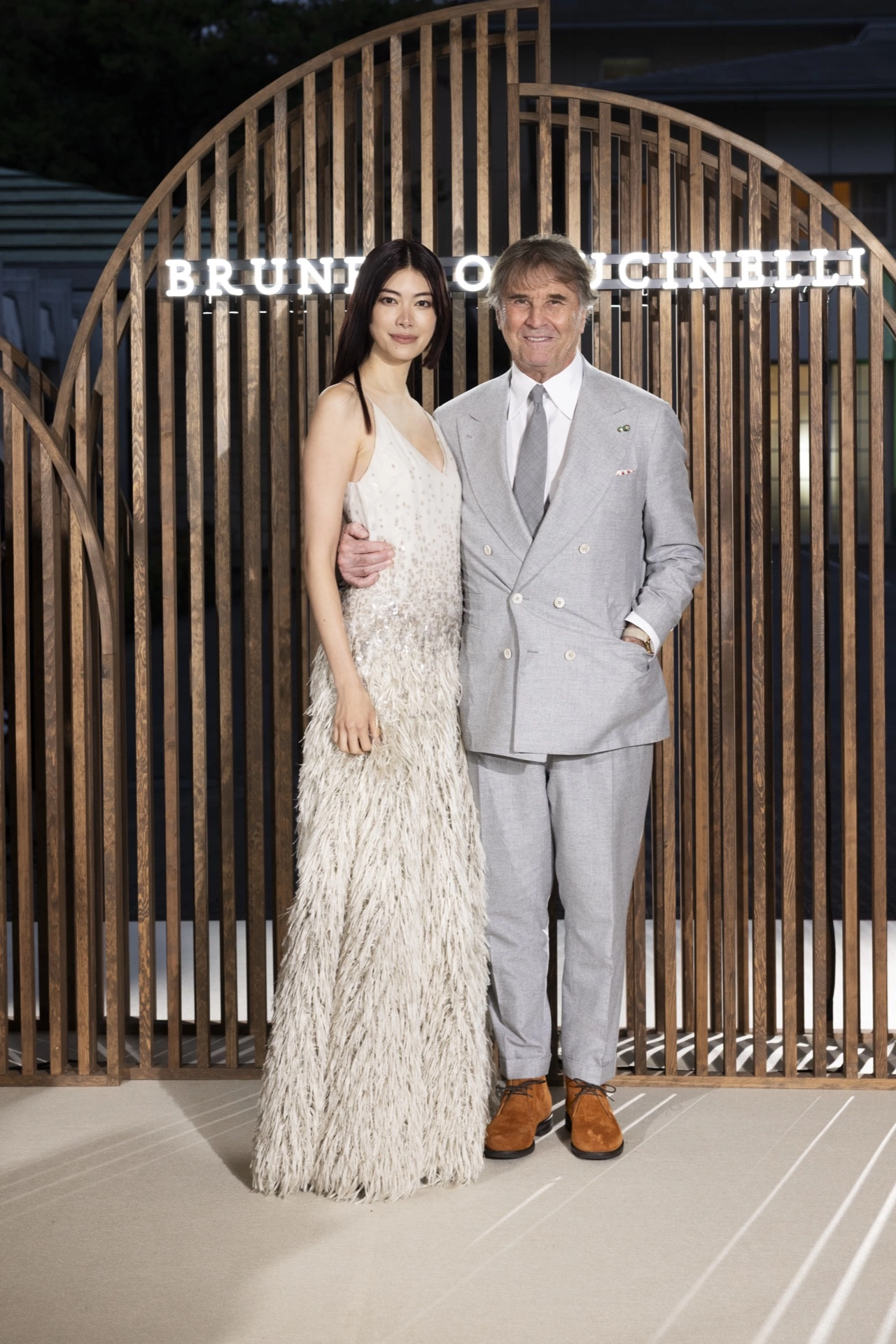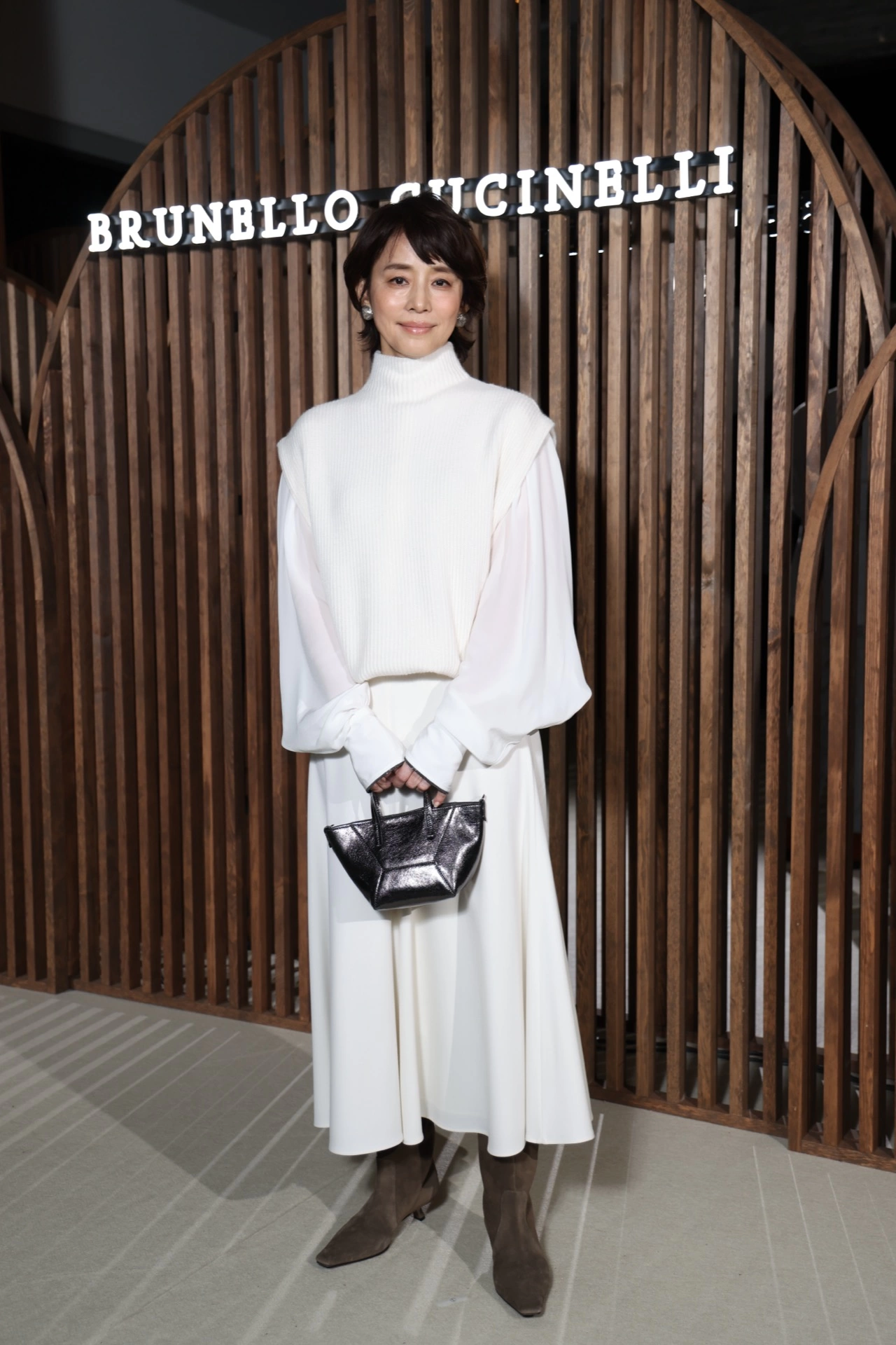 ファッションショーには渡辺謙、石田ゆり子、小雪、杏、玉森裕太、大政絢といったブランドと縁のある豪華セレブリティーがブルネロ クチネリの最新秋冬コレクションを身に纏い、来場しました。さらに、森星はファッションプレゼンテーションのモデルとして出演。イタリア大使館の美しい庭園にスウェードのスポーティーなジャケットに白の透明感のあるチュールのスカートで颯爽と登場しました。
