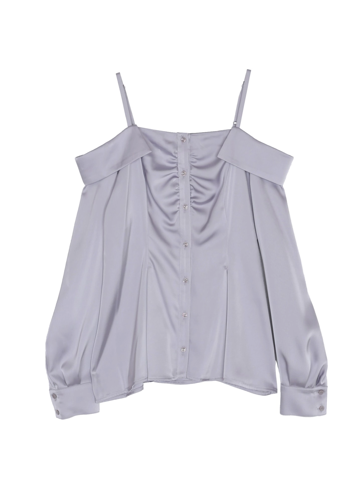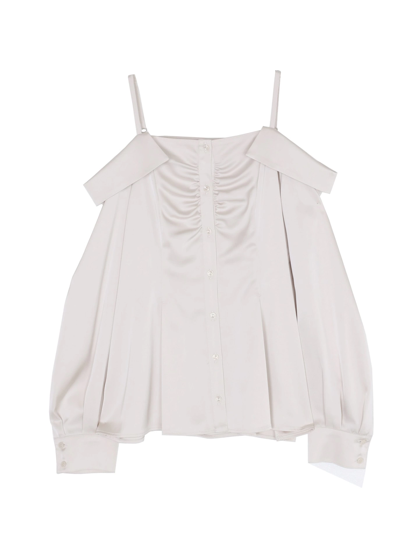 オフショルデザインにシャツカラーを組み合わせた新鮮なデザインが魅力のブラウス。ロングシーズン使える上品な光沢のサテン素材が、女性らしい艶感と都会的なムードを引き立てます。ペプラムシルエットのため、スカート、パンツ問わず合わせやすいのも魅力。オフショルで程よい抜け感と、きちんと感のあるシャツディテールで洗練された大人な印象に。