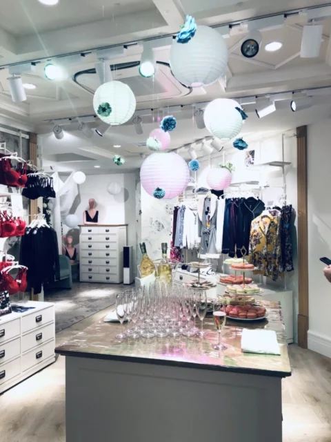 サラ・ジェシカ・パーカーのキャンペーンが飾られたショップのエントランスを入ると、正面奥の壁一面にSS19コレクションが飾られ、ボタニカルプリントやパステルカラーのアイテム、ジオメトリックなレースのランジェリーなどが登場し、そこは春のような陽気で爽やかな雰囲気に溢れていました。また、春夏コレクションに多く登場しているフラワーをフィーチャーして、会場やマネキンは色とりどりの花々で飾られ、フェミニンでセンシュアルな空間がゲストを包みこみました。さらに、3組の華やかなDJの音楽は、会場を大いに盛り上げました。