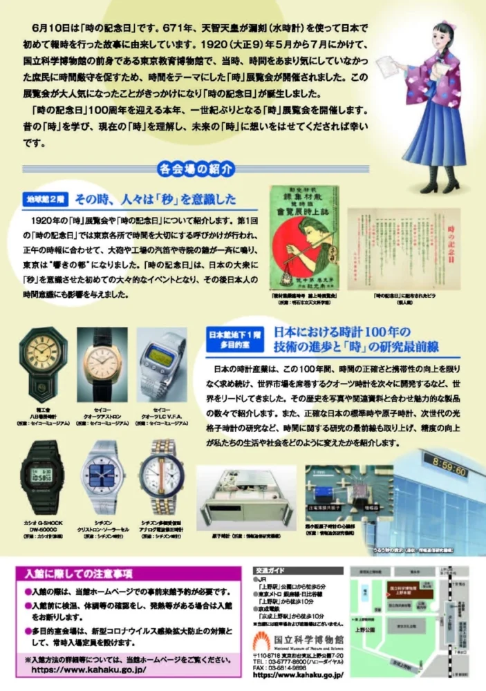 6月10日は「時の記念日」です。1920(大正9)年5月から7月にかけて、国立科学博物館の前身である東京教育博物館で、当時、時間をあまり気にしていなかった庶民に時間厳守を促すため、時間をテーマにした「時」展覧会が開催されました。この展覧会が大人気になったことがきっかけになり「時の記念日」が誕生しました。2020年は「時の記念日」100周年にあたります。