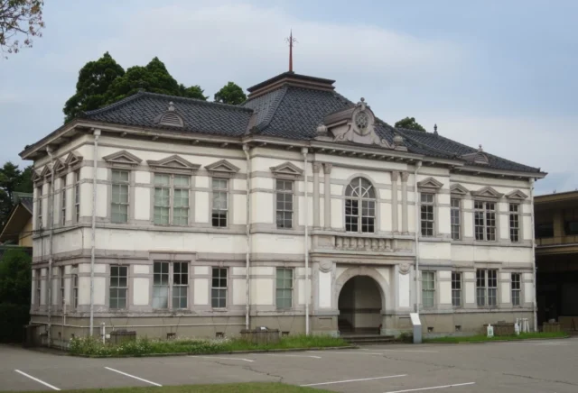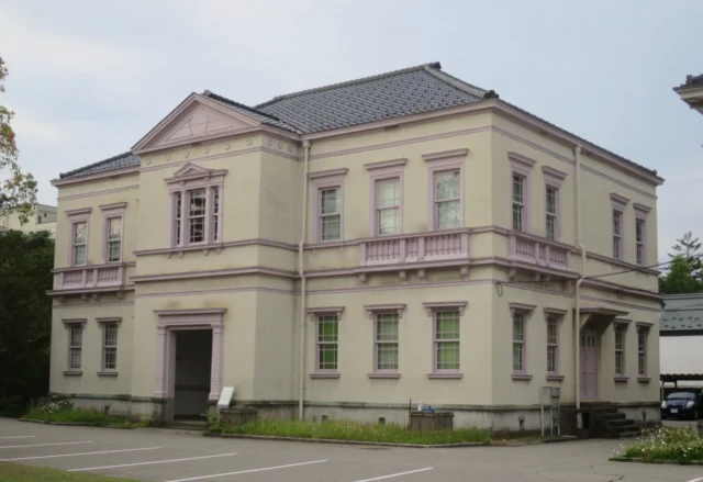 明治期に建てられた二つの旧陸軍の施設、旧陸軍第九師団司令部庁舎<1898年建築>と旧陸軍金沢偕行社<1909年建築>(いずれも1997年に国登録有形文化財に登録)を移築するとともに、過去に撤去された部分や外観の色などを復元して活用しています。入口向かって左側の旧陸軍第九師団司令部庁舎は、師団司令部の執務室として、また右側の旧陸軍金沢偕行社は、陸軍将校の社交場として使われていました。展示室部分はRC造で復元して新築し、外観は今回の移築改修に伴い判明した建築当時の色を再現しています。