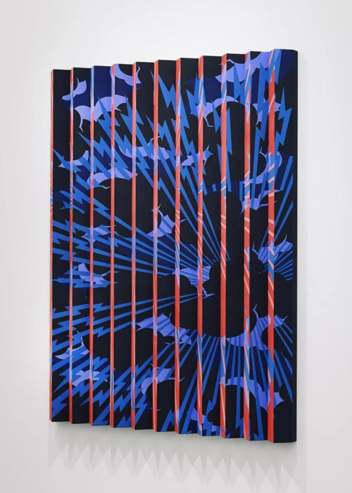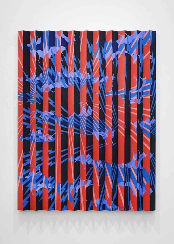 《デュアリティ・ペインティング》は、人における抱擁という行為がふたつの存在をひとつのものに変えることと同じように、「生と死」、「天と地」、「男と女」などの象徴的な異なる要素の親和性を探り、画面上で再構成することで、習合主義(syncretism)を形式的に表現している絵画作品です。本作は、立体的な蛇腹型の木製支持体を使用し、アクリルガッシュによって彩色がされています。